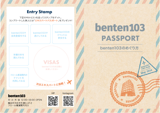benten103には、利用をさらに楽しくする仕掛け「Entry Stamp」プログラムがあります。会員登録、スペース利用、イベント参加などから、3つのスタンプを集めると、特別な「エキスパートパスポート」をプレゼント!