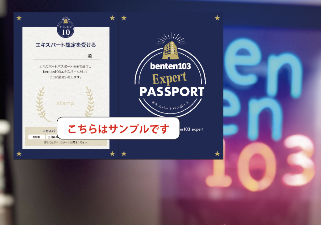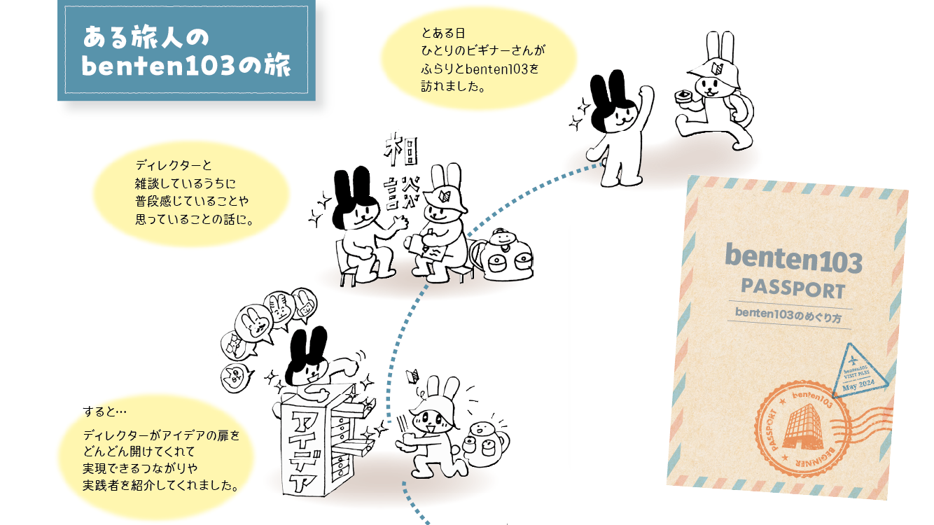 エキスパートパスポートでは10個のチャレンジを用意しています。benten103の利用方法を具体的に体験しながら知っていただくためのチャレンジです。これらのパスポートが、あなたの次の一歩につながることを願っています。さあ、あなたもbenten103で、新しい自分と、新しい仲間、そして新しい「まち」との出会いを見つけにいきませんか?