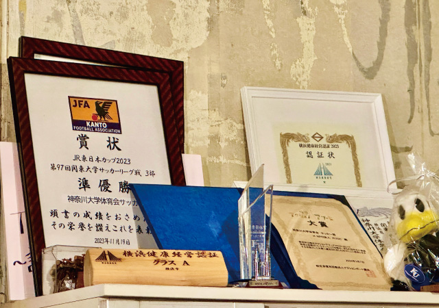 竹山キッチン(神大喫茶)の食器棚の上に無造作に飾られた賞状類。このキッチンは寮生が食事をとる場所にもなっています。空き部屋が増えてしまった団地の上層階を神奈川大学サッカー部が寮として利活用しているのです。エレベーターが無い上層階もサッカー部員の筋力アップには好都合という、デメリットのアップサイクルです。