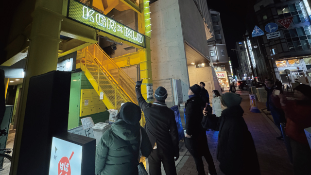 いろは、のネオンサインは今年の新作。ひらがなを光らせるためには文字をつなげる電線が透明のガラス管で配置されています。その仕組みの目新しさもさながら、お店のお品書きに珍しい焼酎の銘柄を発見した方がいて、「ここ〇〇が飲めるみたいよ!」「えー!飲みたい!」と盛り上がる参加者たち。